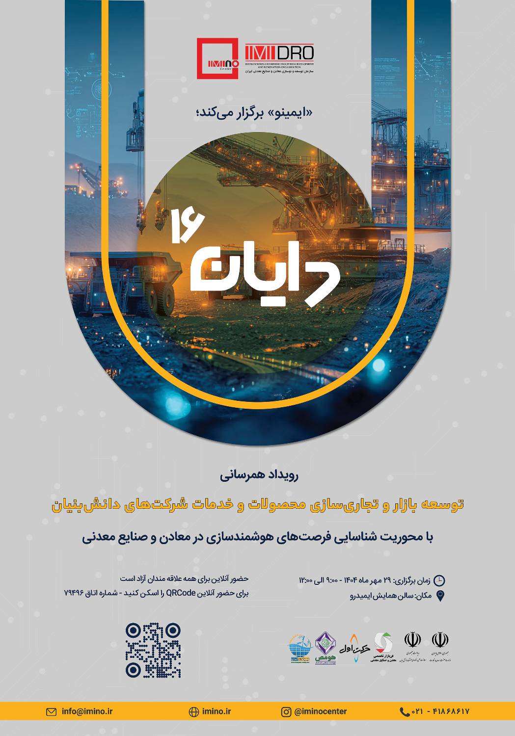 شانزدهمین رویداد همرسانی «دایان» با تمرکز بر نوآوری‌های هوش مصنوعی و تحول دیجیتال در حوزه معدن و صنایع معدنی روز سه شنبه ۲۹ مهر ۱۴۰۴ به میزبانی ایمینو با حمایت ایمیدرو برگزار می‌شود.