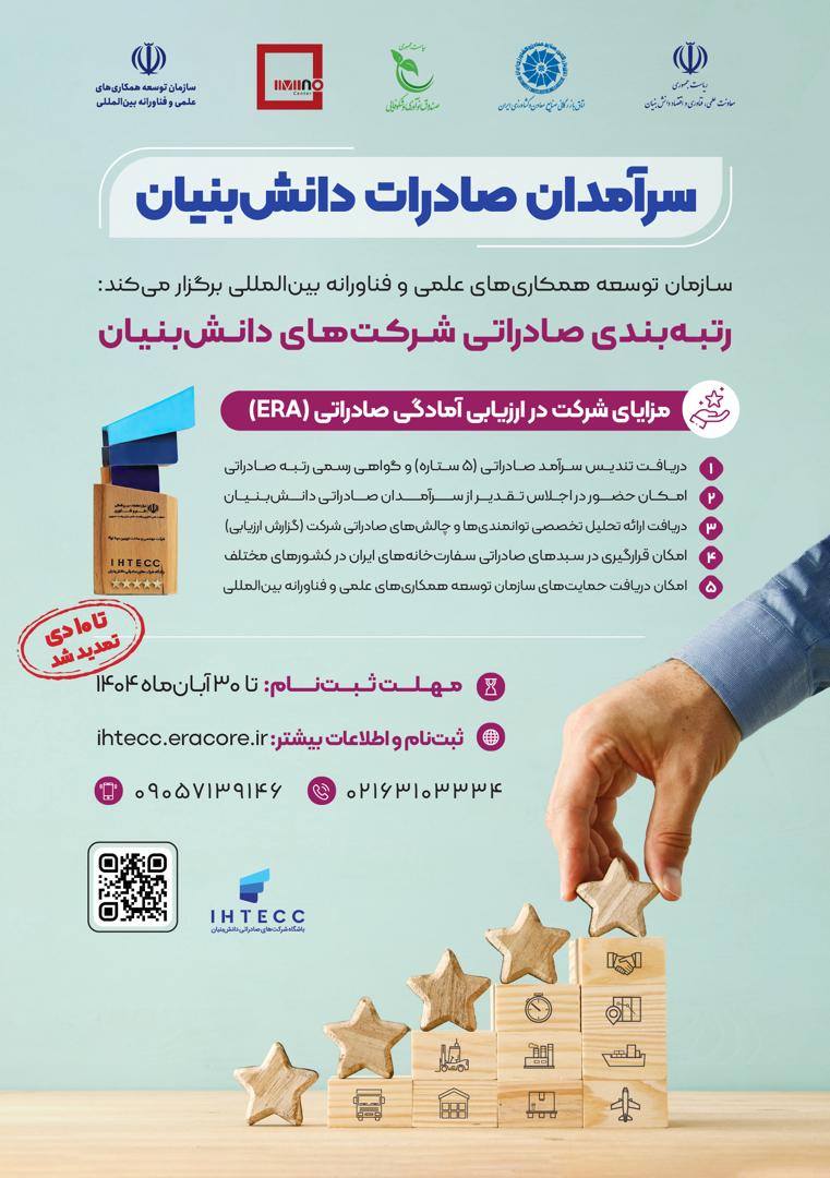 با همکاری مرکز نوآوری معدن و صنایع معدنی ایران (ایمینو) و سازمان توسعه همکاری‌های علمی و فناورانه بین‌المللی، رویداد «سرآمدان صادرات دانش‌بنیان» با محوریت رتبه‌بندی صادراتی و ارزیابی آمادگی شرکت‌های دانش‌بنیان برای حضور مؤثر در بازارهای بین‌المللی برگزار می‌شود.