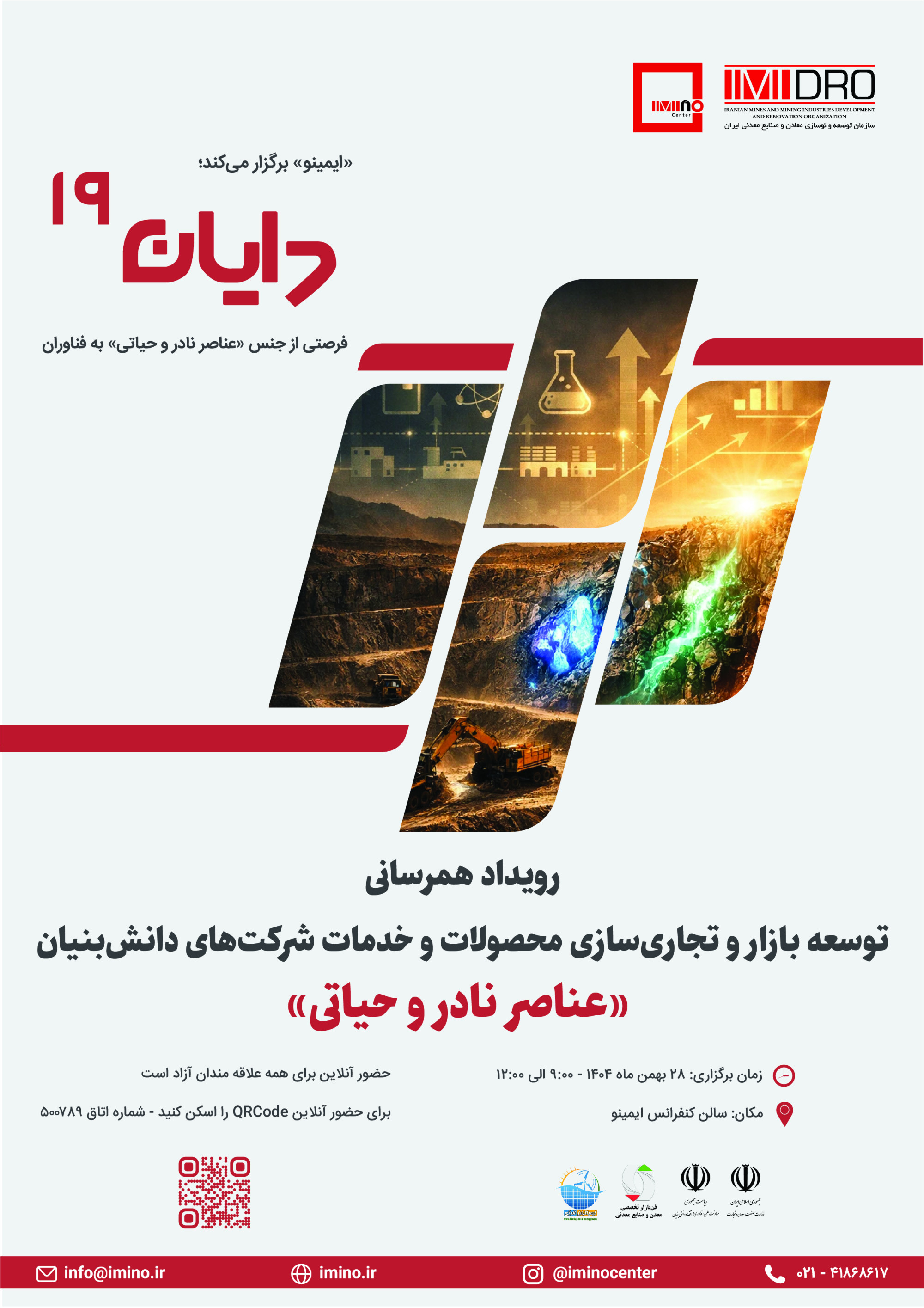 نوزدهمین رویداد همرسانی «دایان» در راستای توسعه بازار، تجاری‌سازی و حمایت از محصولات و خدمات شرکت‌های دانش‌بنیان با محور عناصر نادر و حیاتی به همت مرکز نوآوری معادن و صنایع معدنی ایران (ایمینو) برگزار می‌شود.